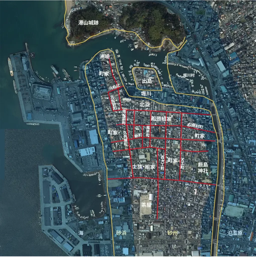 航空写真に赤線で江戸期の町割り、黄色で推定される江戸期の海岸・河川の際を示した。